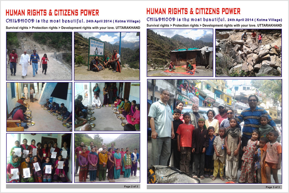 the Founder of HRCP Mr.Ajeet Sharma with a very beautiful thought in his mind & heart visited Uttarakhand Disaster affected areas on 24th apr 2014 with HRCP team where they performed various deeds like feeding the needy,promoting girls education ensuring right to live,right to education & right to liberty.During the same course they looked pretty fun making which they always are..thier efforts were highly appriciated by few social Personalities:Mrs.Mangla & Rudraprayag Dist.Administrator.